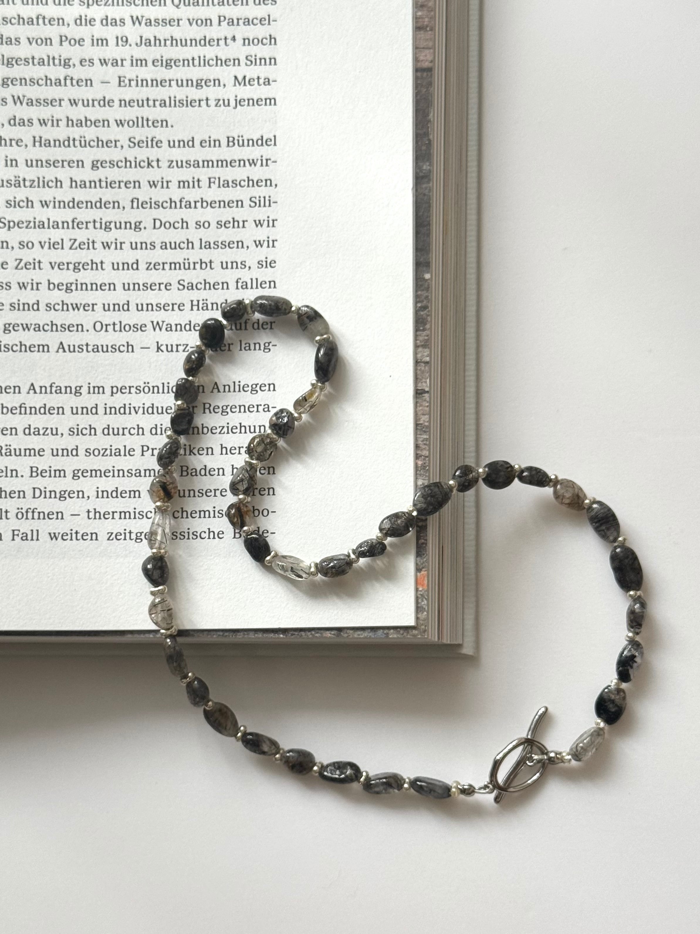 MATERIAL:ブラックルチルクォーツ、ガラスビーズ(メッキ加工)、真鍮(マンテル)